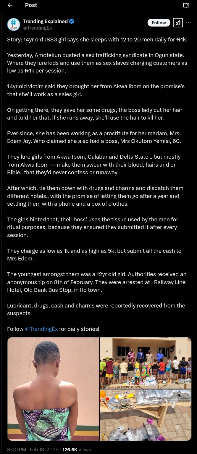 The JSS3 student, brought from Akwa Ibom, was coerced into sleeping with 12-20 men daily for ₦1,000 each.