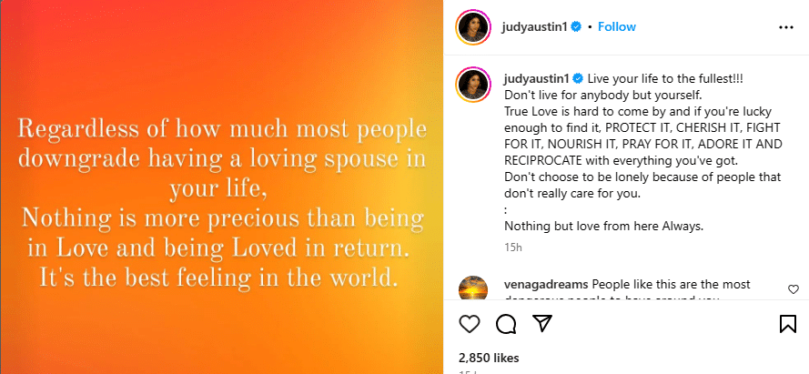 Controversial actress, Judy Austin has incurred the wrath of netizens as she writes advice to Nigerians about fighting for their true love.