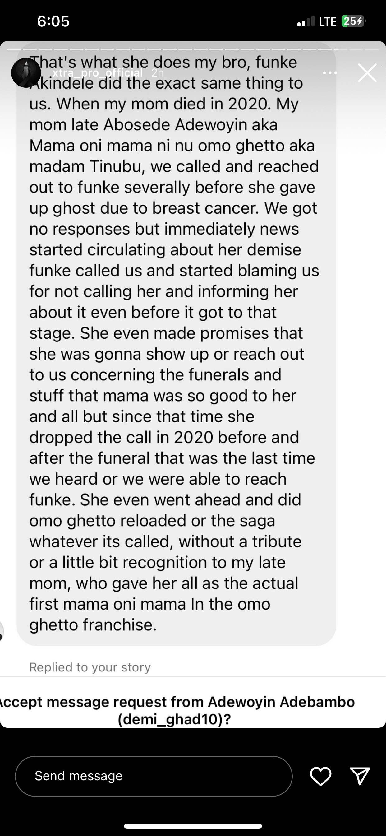 Following the actress’ death, her brother confronted Funke Akindele for publicly mourning her while abandoning his sister in her final moments.