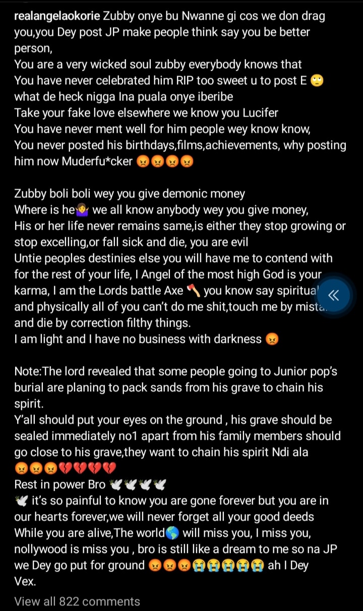 Angela Okorie, however, continues to criticize Zubby for what she perceives as hypocrisy in his tribute to the late actor. She pointed out that Zubby never acknowledged Pope while he was alive.