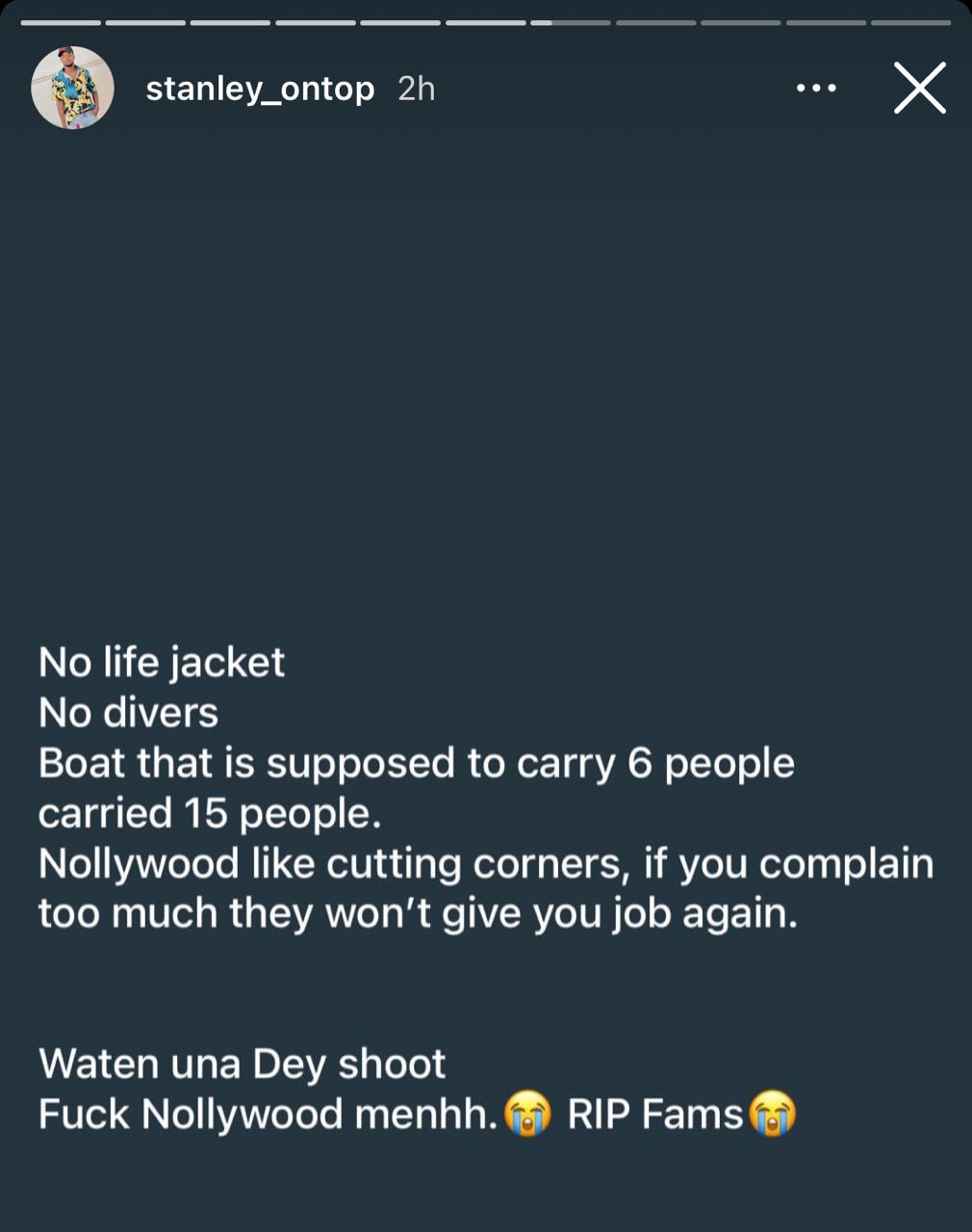 “No life jacket No divers Boat that is supposed to carry 6 people carried 15 people. Nollywood like cutting corners, if you complain too much they won’t give you job again. Waten una Dey shoot Fuck Nollywood menhh. T RIP Fams.”