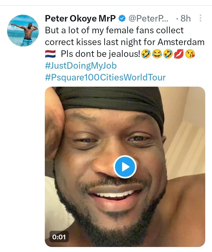 “But a lot of my female fans collect correct kisses last night for Amsterdam🇳🇱🫣Pls dont be jealous!🤣😂🤣💋😘 #JustDoingMyJob #Psquare100CitiesWorldTour”