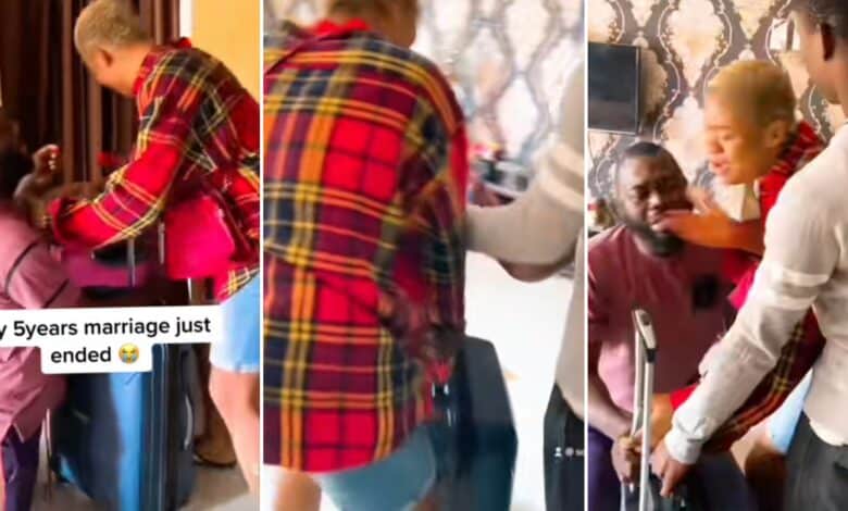In the video, her husband who was on his knees, pleaded with her to forgive him and stay back but she insisted on leaving.