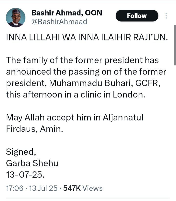 His former spokesperson, Garba Shehu, confirmed the news in a post shared on X on Sunday.