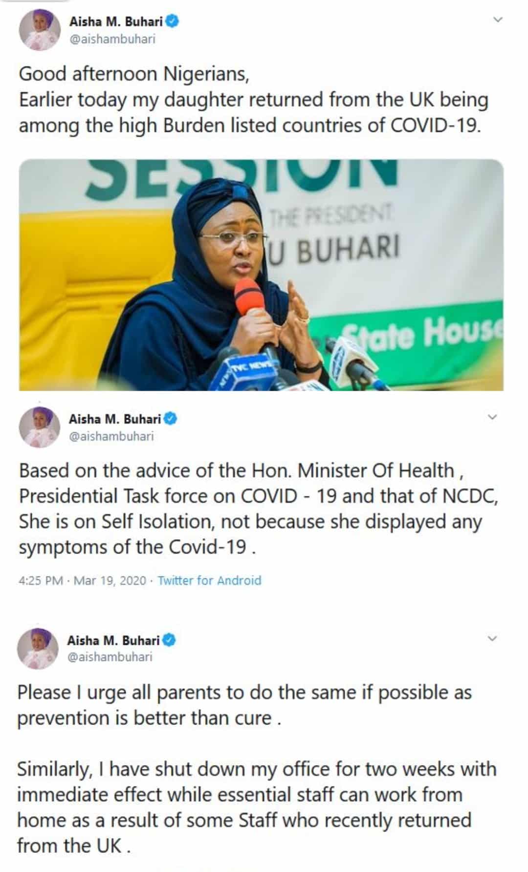 Aisha Buhari, the first lady, who disclosed this via Twitter, stated that although her daughter did not show any symptoms of the virus, she went into self-isolation immediately after she returned from the UK.