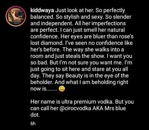 But to everyone’s utter amazement, Kiddwaya is referring to his favorite major brand, Ciroc Vodka which is on the table he is staring at in the picture he shared.