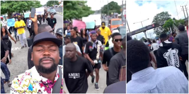 The protesters were seen marching through the city, carrying placards and chanting slogans, accusing Naira Marley, his former boss, of being responsible for Mohbad’s untimely demise.