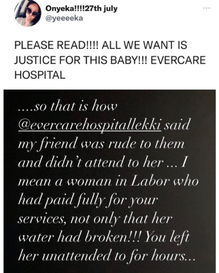 On what transpired in the hospital, she posted screenshots which read, “So that is how @evercarehospitallekki said my friend was rude to them and didn’t attend to her … I mean a woman in Labor who had paid fully for your services, not only that her water had broken!!! You left her unattended to for hours.