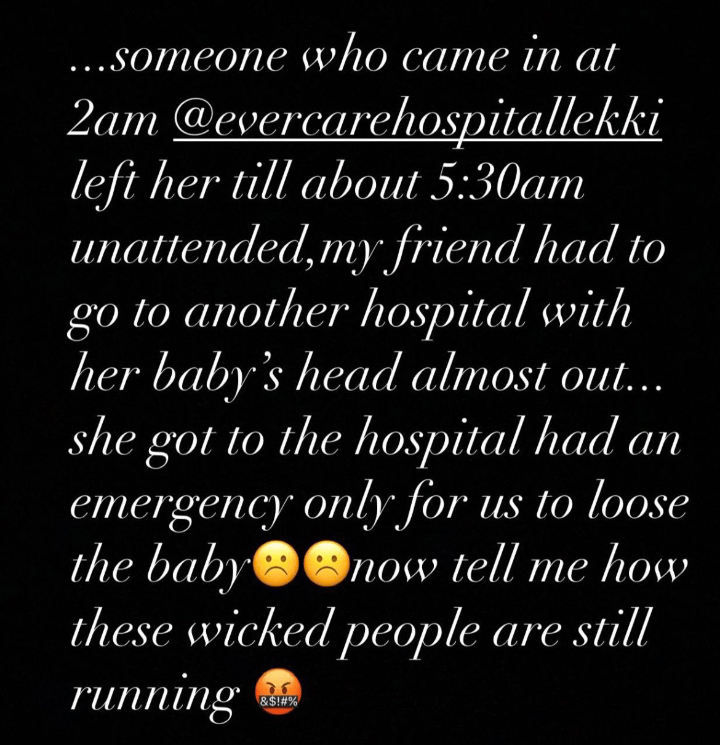 “Someone who came in at 2am @evercarehospitallekki left her till about 5:30am unattended, my friend had to go to another hospital with her baby’s head almost out… she got to the hospital had an emergency only for us to loose the baby now tell me how these wicked people are still running.