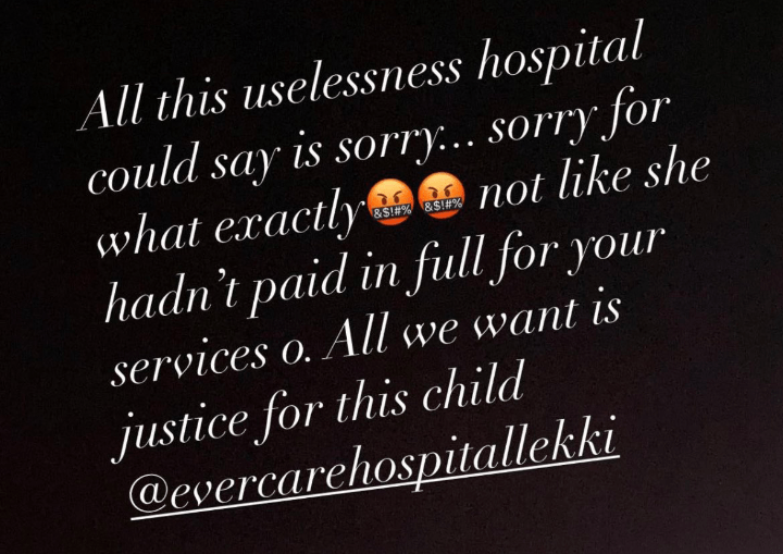 “All this uselessness hospital could say is sorry… sorry for what exactly not like she &SEX &S!#% hadn’t paid in full for your services o. All we want is justice for this child @evercarehospitallekki.”