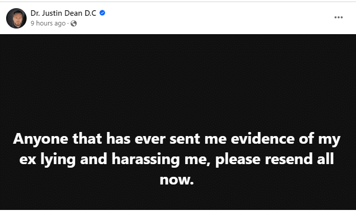 Justin Dean recently took to his social media page to call on netizens to resend evidence of his ex-wife lying or harassing him which had been sent to him in the past.