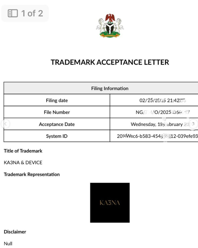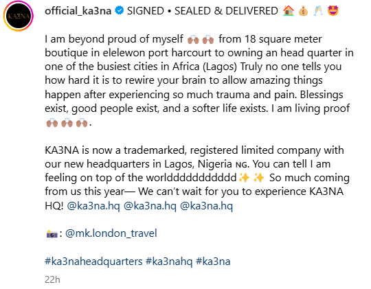 In addition to her property acquisition, Ka3na announced that her business is now officially trademarked and registered as a limited company.