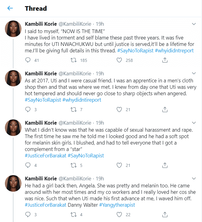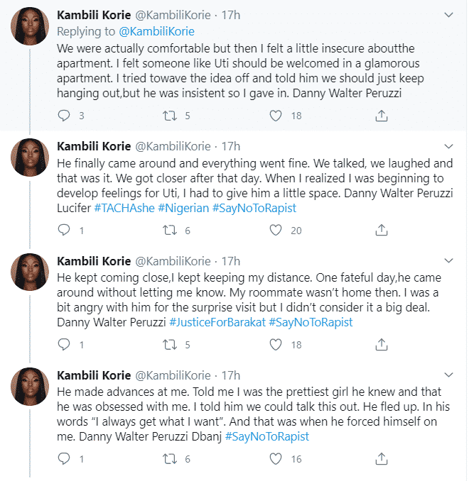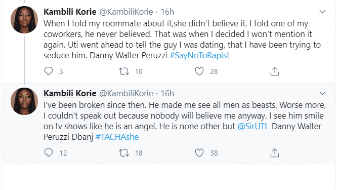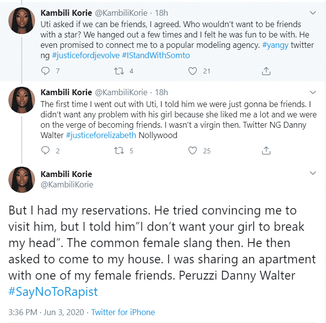 A lady, Kambili Korie has called him out and accused him of raping her in 2017 when they were casual friends.