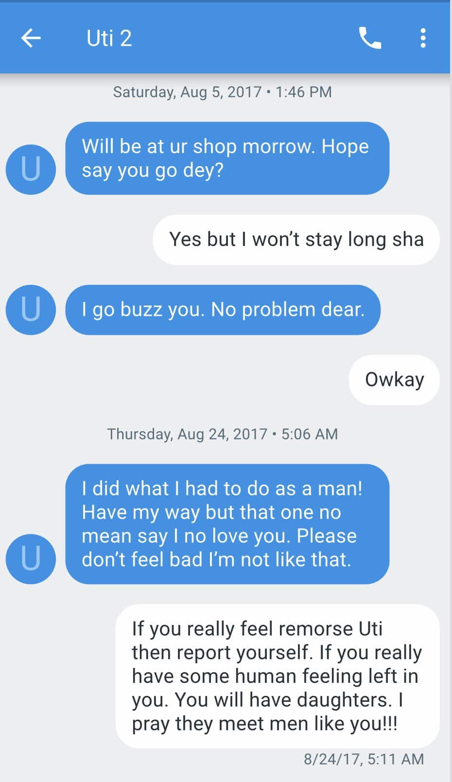 I have lived in torment and self blame these past three years. It was five minutes for UTI NWACHUKWU but until justice is served,it’ll be a lifetime for me.I’ll be giving full details in this thread.