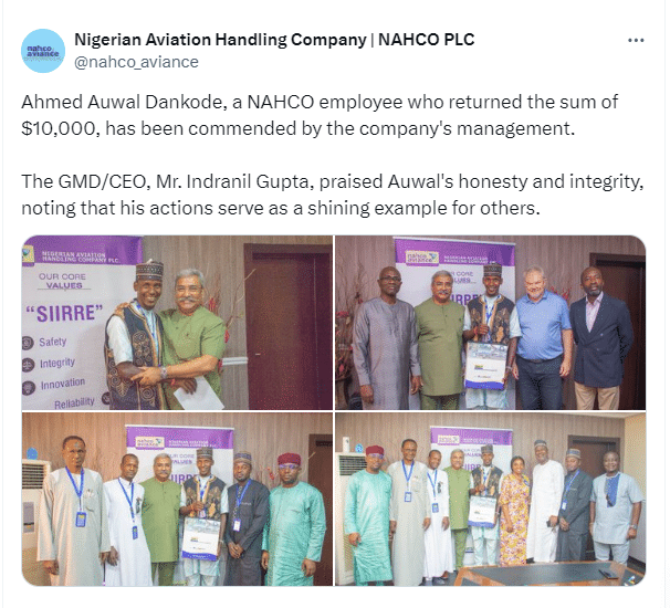 “Ahmed Auwal Dankode, a NAHCO employee who returned the sum of $10,000, has been commended by the company’s management.