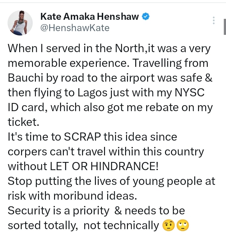 In a post on her Twitter page, the actress submitted that it would be a better idea to scrap the scheme since corps members cannot travel the country without risks to their safety.