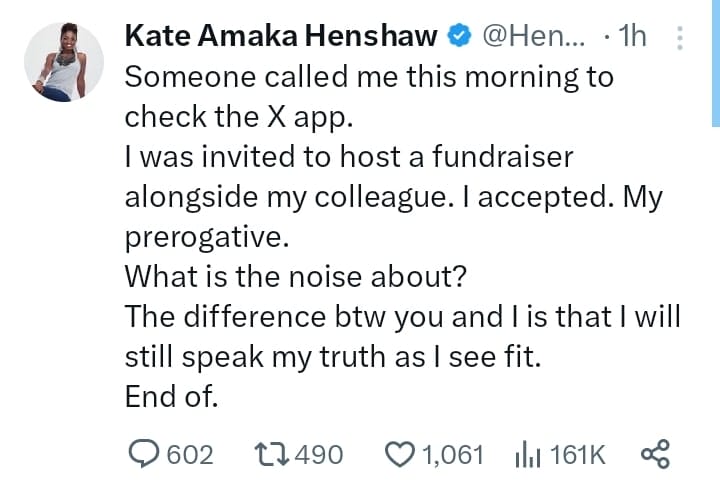 “Someone called me this morning to check the X app. I was invited to host a fundraiser alongside my colleague. I accepted, my prerogative. What is the noise about? The difference btw you and me is that I will still speak my truth as I see fit. End of”.