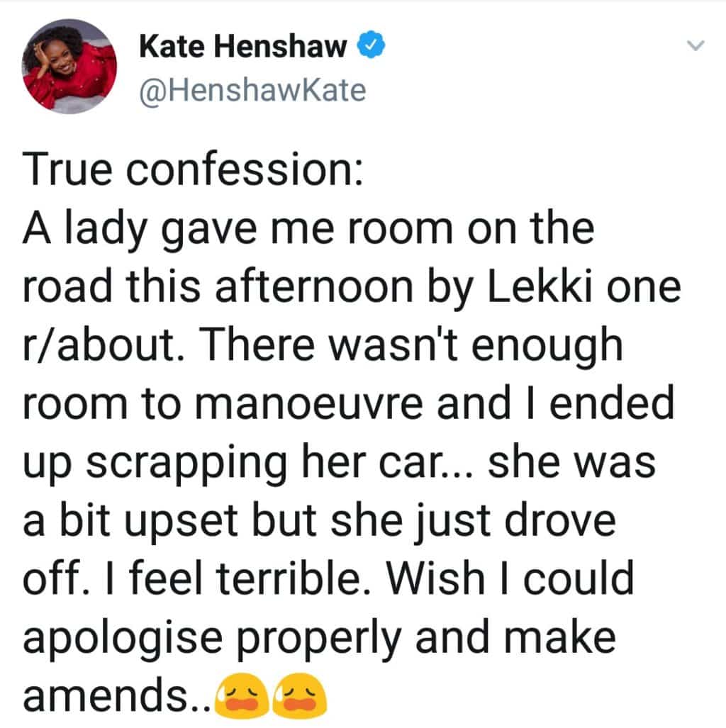 “A lady gave me room on the road this afternoon by Lekki one r/about. There wasn’t enough room to manoeuvre and I ended up scrapping her car… she was a bit upset but she just drove off. I feel terrible. Wish I could apologise properly and make amends..??”
