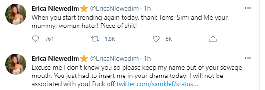 ”Excuse me I don’t know you so please keep my name out of your sewage mouth. You just had to insert me in your drama today! I will not be associated with you! Fuck offWhen you start trending again today, thank Tems, Simi and Me your mummy, woman hater! Piece of shit!,” Erica wrote in response.