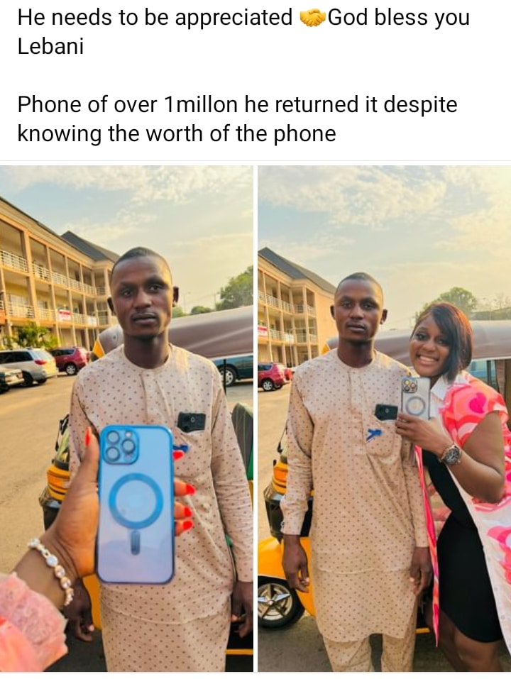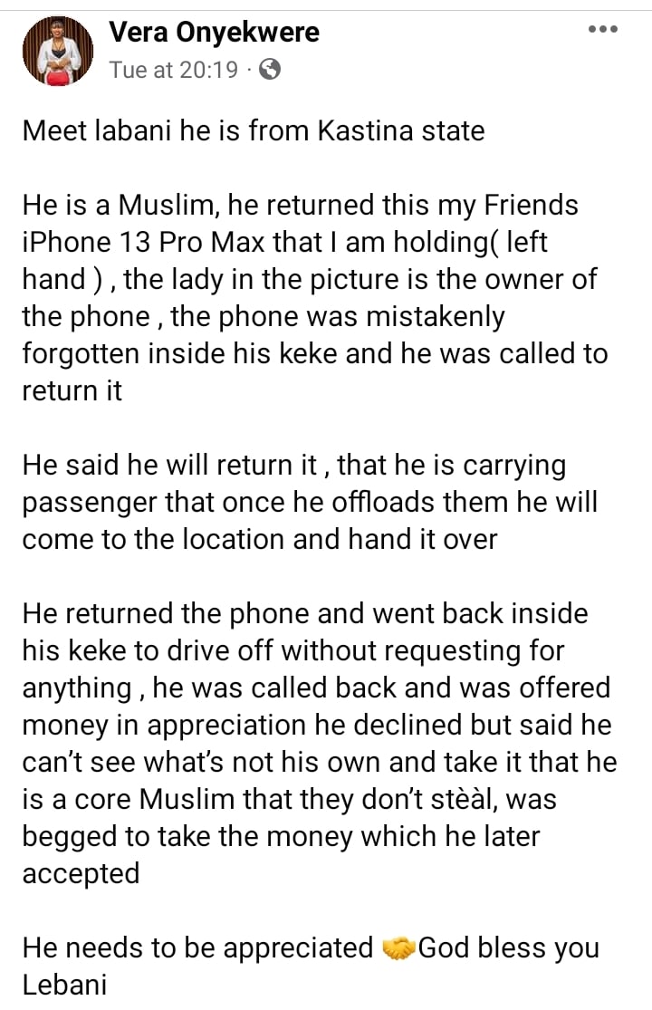 He is a Muslim, he returned this my Friends iPhone 13 Pro Max that I am holding( left hand ) , the lady in the picture is the owner of the phone , the phone was mistakenly forgotten inside his keke and he was called to return it