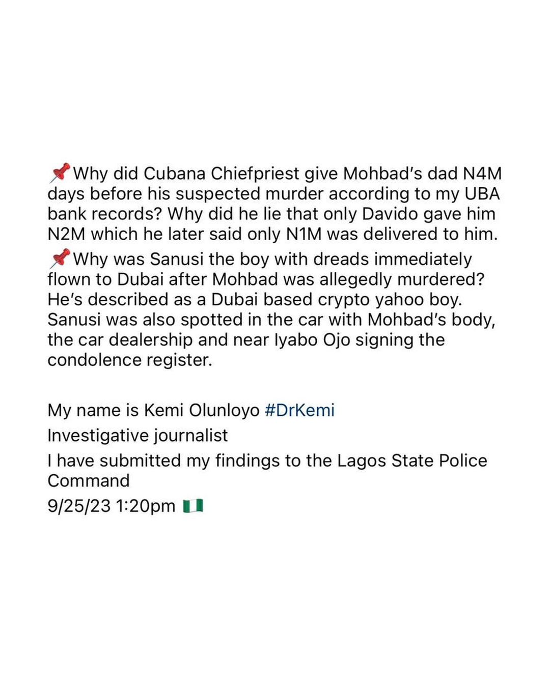 Why did Cubana Chiefpriest give Mohbad’s dad N4M days before his suspected murder according to my UBA bank records? Why did he lie that only Davido gave him N2M which he later said only N1M was delivered to him.