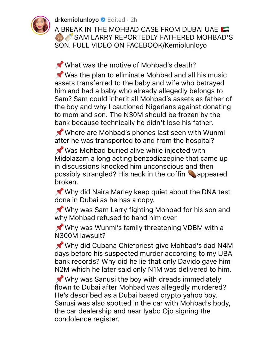 “BREAK IN THE MOHBAD CASE FROM DUBAI UAE SAM LARRY REPORTEDLY FATHERED MOHBAD’S SON.