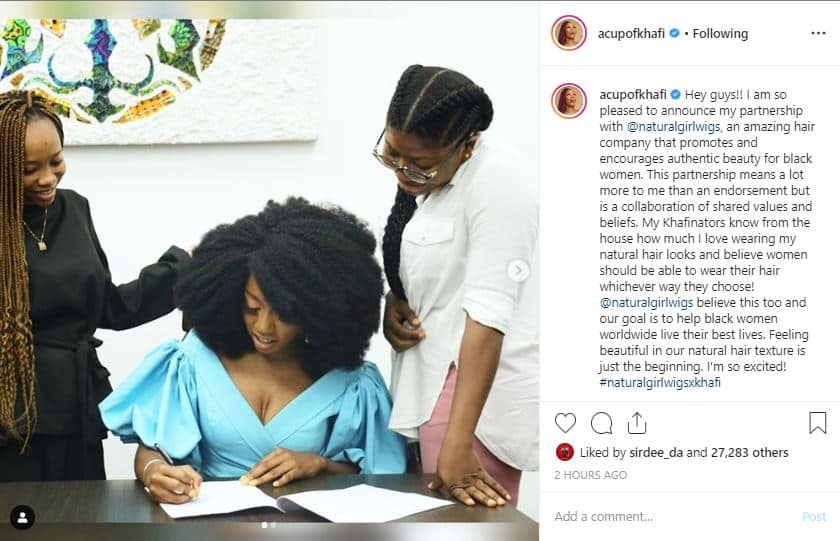 BBNaija’s Khafi Kareem has announced that she is now the brand ambassador of Natural Girl Wigs. The black beauty took to her IG page to share a photo where she was seen signing the deal with the hair brand.
