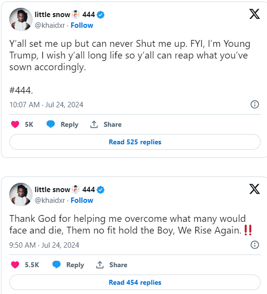 “Y’all set moup but can never Shut me up. FYI, I’m Young Trump, I wish y’all long life so y’all can reap what you’ve sown accordingly.