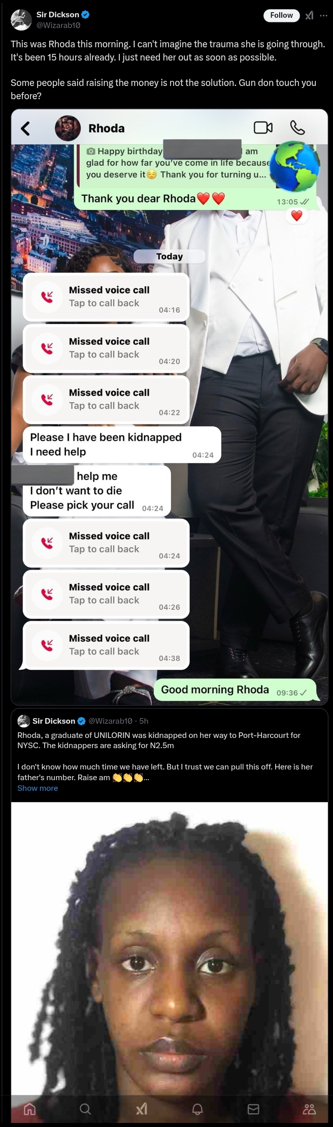 The last WhatsApp message of Rhoda, a UNILORIN student who was kidnapped while on her way to Port Harcourt for NYSC, has surfaced online.