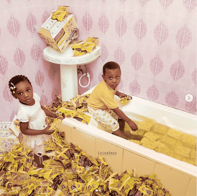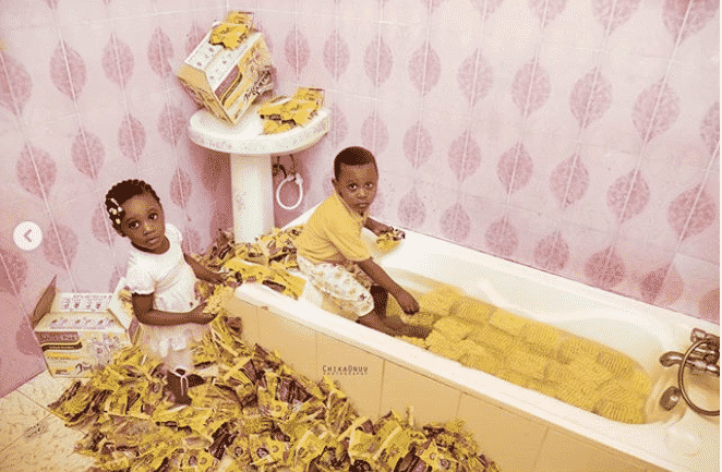 A Nigerian photographer, Chika Onuu shot two kids as they unpacked and soaked two cartons of Indomie noodles inside a bathtub filled with water.