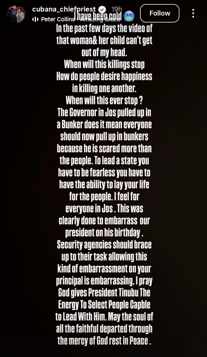 Popular Nigerian socialite Cubana ChiefPriest has reacted to the recent killings in Jos, alleging that the attacks were orchestrated to embarrass President Bola Ahmed Tinubu on his birthday.