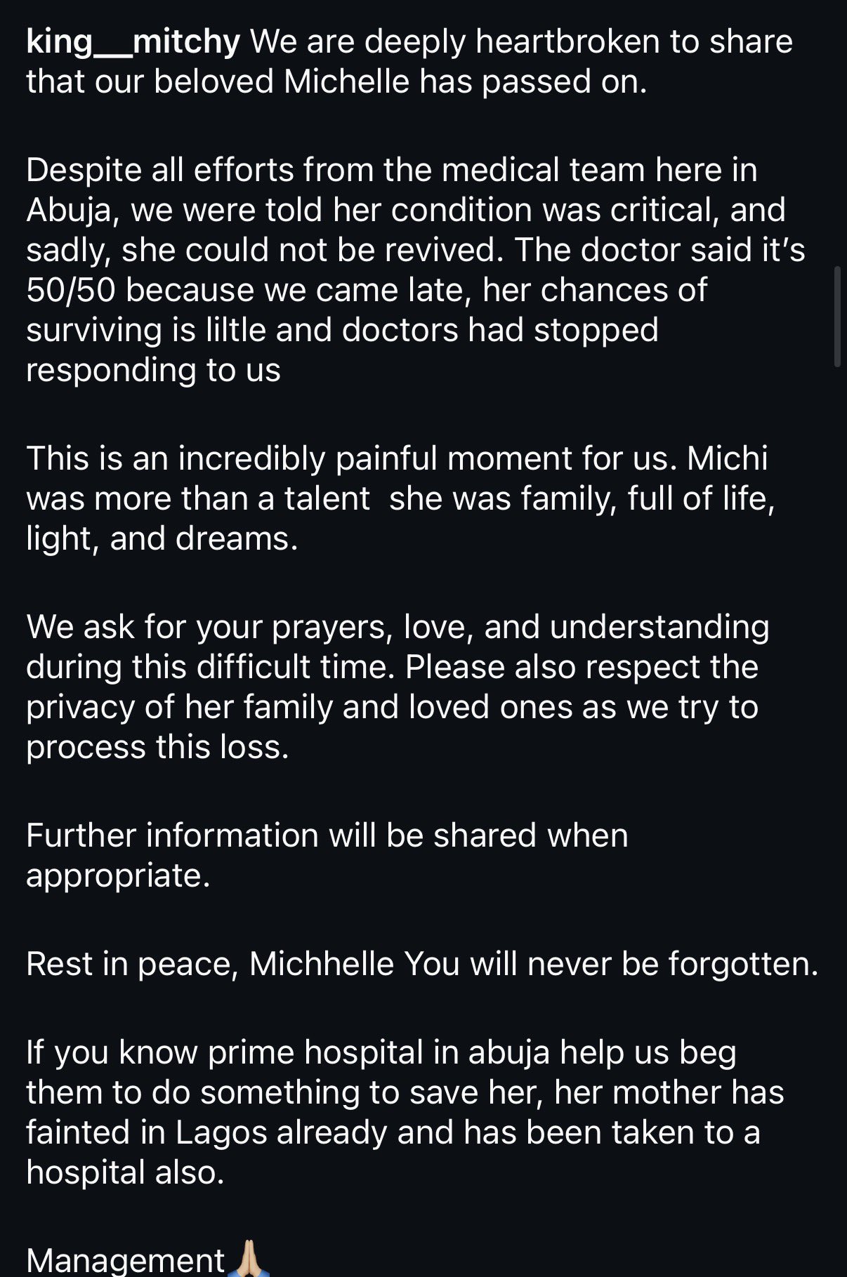In her post, the lady wrote, “King Mitchy IS NOT DEAD!!!”