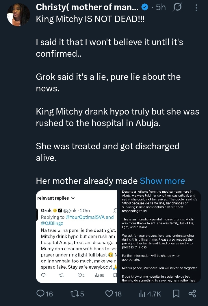 “King Mitchy is not dead” — Lady shares what she discovered