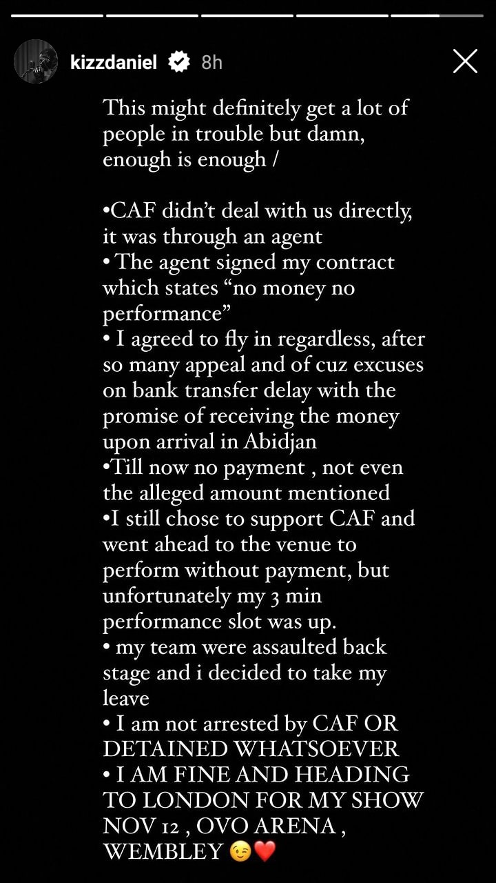 Popular singer, Kizz Daniel has debunked reports of being arrested in Ivory Coast and being detained by CAF over alleged refusal to perform.