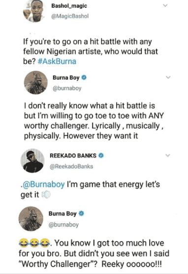 When Reekado Banks signified his interest to challenge him, Burna delivered a savage reply saying: ‘You know I got too much love for you bro. But didn’t you see wen I said “Worthy Challenger”? Reeky oooooo!!!.’