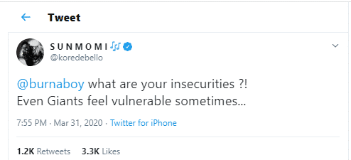 Soon after, Korede Bello who appeared to be reacting to Burna Boy’s savage reply to Reekado Banks, asked the ‘Odogwu’ crooner: ‘@burnaboy what are your insecurities ?! Even Giants feel vulnerable sometimes…