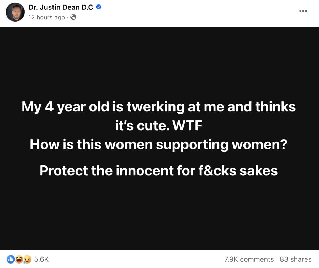 “My 4 year old is twerking at me and thinks it’s cute. WTF. How is this women supporting women? Protect the innocent for f&cks sakes,” he wrote in a post.