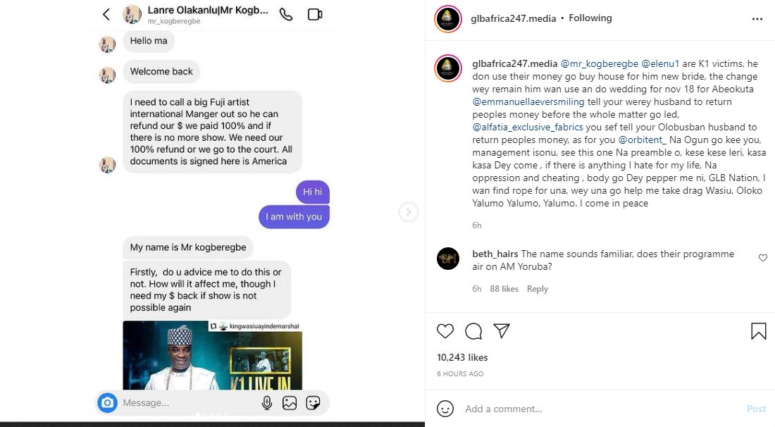 Fuji maestro, King Waiu Ayinde Marshal better known as Kwam1 has been called out for allegedly refusing to refund the money of clients after failing to perform in their respective events.
