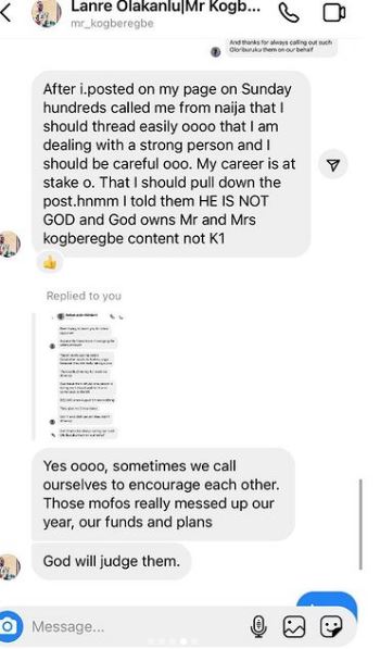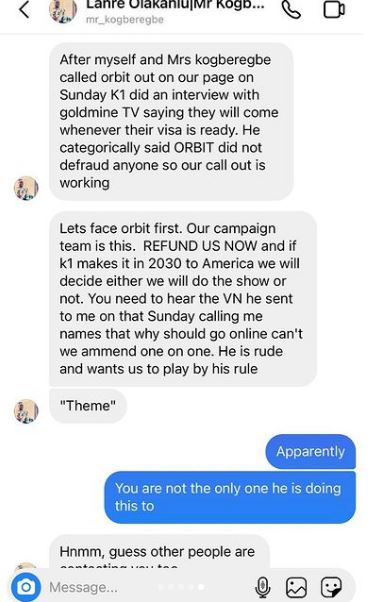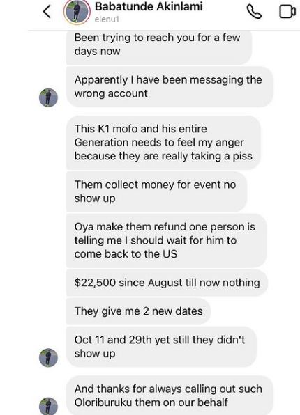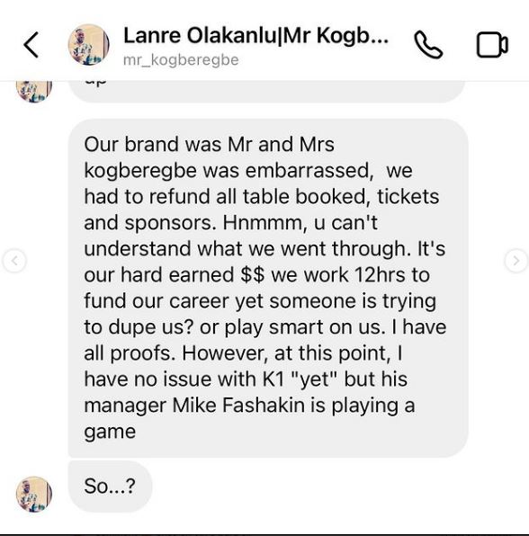 “Ade ori Okin go soon turn to Ade ori dragging like small generator, if you think you are big and can oppress people then you lie, you had to go arrange oloriburuku interview with hungry goldmyne abi, all these I never chop media houses, K1 pay people their money , about two of your victims are crying in my dm , you didn’t show up for their show, which is enough embarrassment for them, return their money, it’s that simple, by the time this whole matter sup Ogagun Wasiu oloko dogi dope, Giveaway prick, you nor go like am, I go give all your debtors your Wedding venue for Abeokuta where you and Emmanuella wan do wedding for nov 18, you don’t want to go this lane with me I promise you.