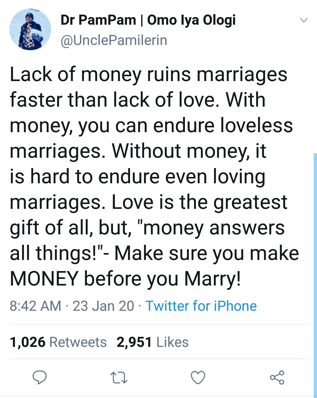 “Lack of money ruins marriages faster than lack of love”- Pamilerin says
