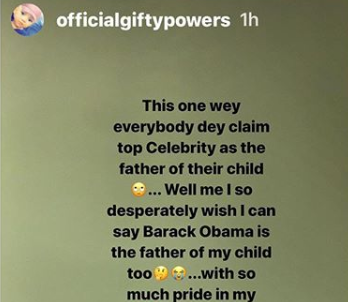 Gifty Powers wrote “This one wey everybody dey claim top celebrity as the father of their child…well me I so desperately wish I can say Barack Obama is the father of my child too…with so much pride in my heart, I will so shake the universe.