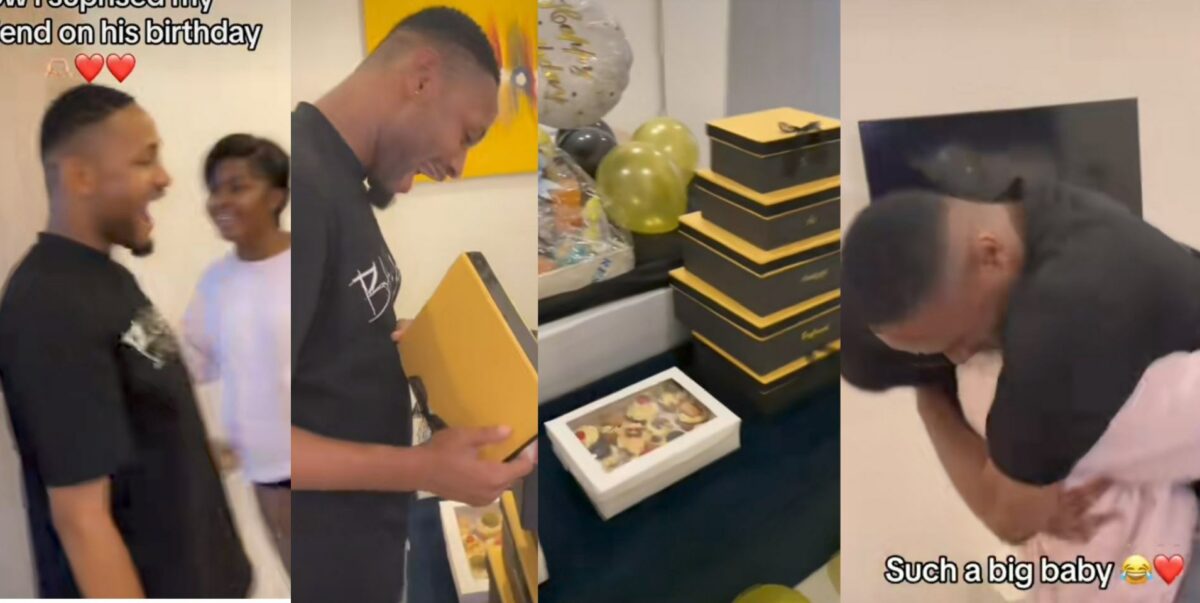 In a beautiful gesture, a lady has made her boyfriend emotional as she surprises him with an assortment of gifts and cake on his birthday.