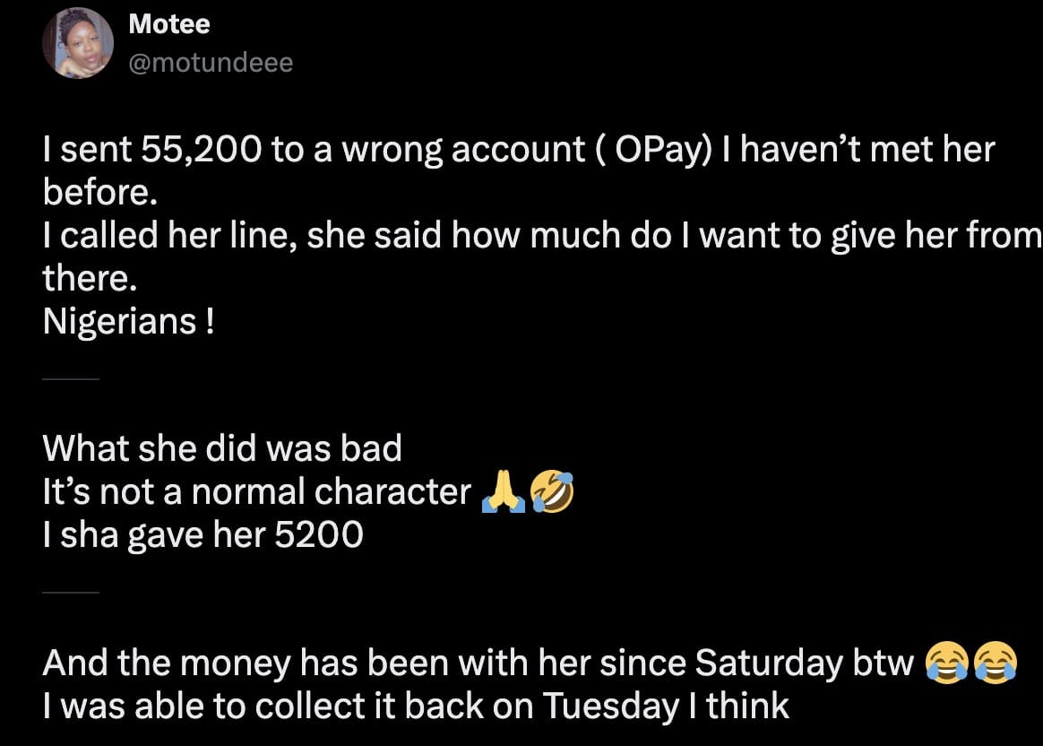 “I sent ₦55,200 to a wrong account (Opay). I haven’t met her before. I called her line, she said, ‘How much do I want to give her from there?’” she wrote.