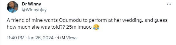“A friend of mine wants Odumodu to perform at her wedding, and guess how much she was told?? 25m lmaoo 😂”
