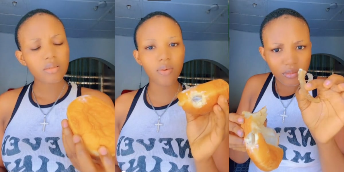 Young lady baffled as she shares video of what she found inside a milky doughnut that she bought from a Nigerian eatery.