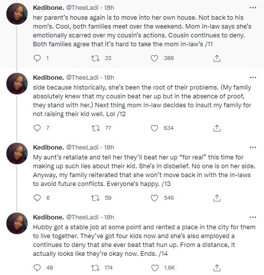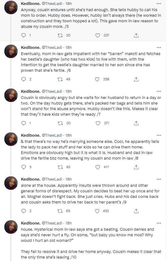 According to a narration by a Twitter user, @Theeladi, her cousin who was in a toxic relationship with her mother-in-law loses her cool after series of tantrums about her childlessness in the marriage.