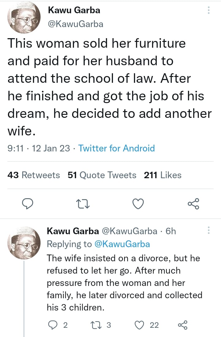 “This woman sold her furniture and paid for her husband to attend the school of law. After he finished and got the job of his dream, he decided to add another wife.