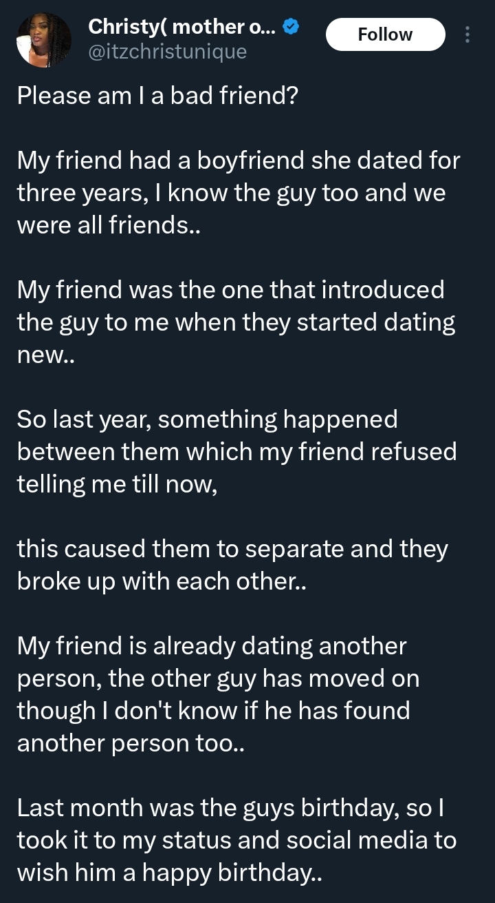 The story has sparked discussion among social media users, with many weighing in on the ethics of friendship, loyalty, and boundaries after a breakup.