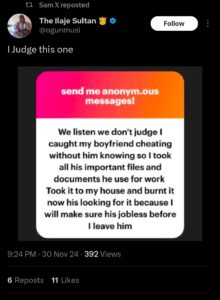 The post reads: “We listen, we don’t judge. I caught my boyfriend cheating without him knowing, so I took all his important files and documents he uses for work, brought them to my house, and burned them. Now, he’s looking for them everywhere, but I’ll make sure he’s jobless before I leave him.”