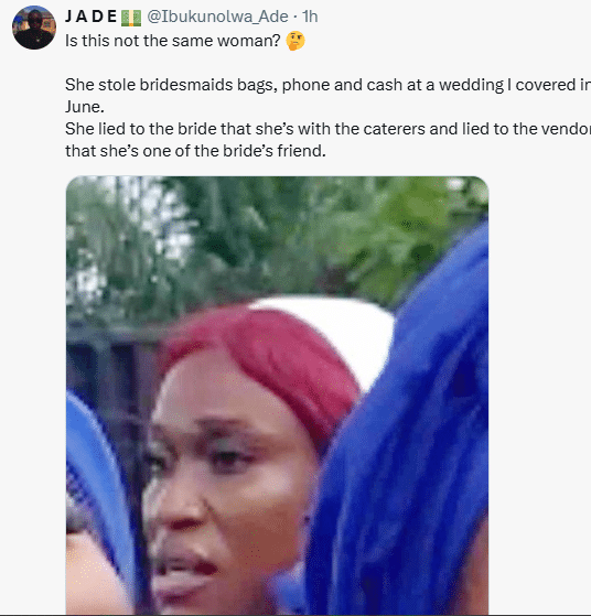 Nigerian lady called out for allegedly posing as the sister of the bride to steal her phone and all the cash sprayed on the couple during the wedding.